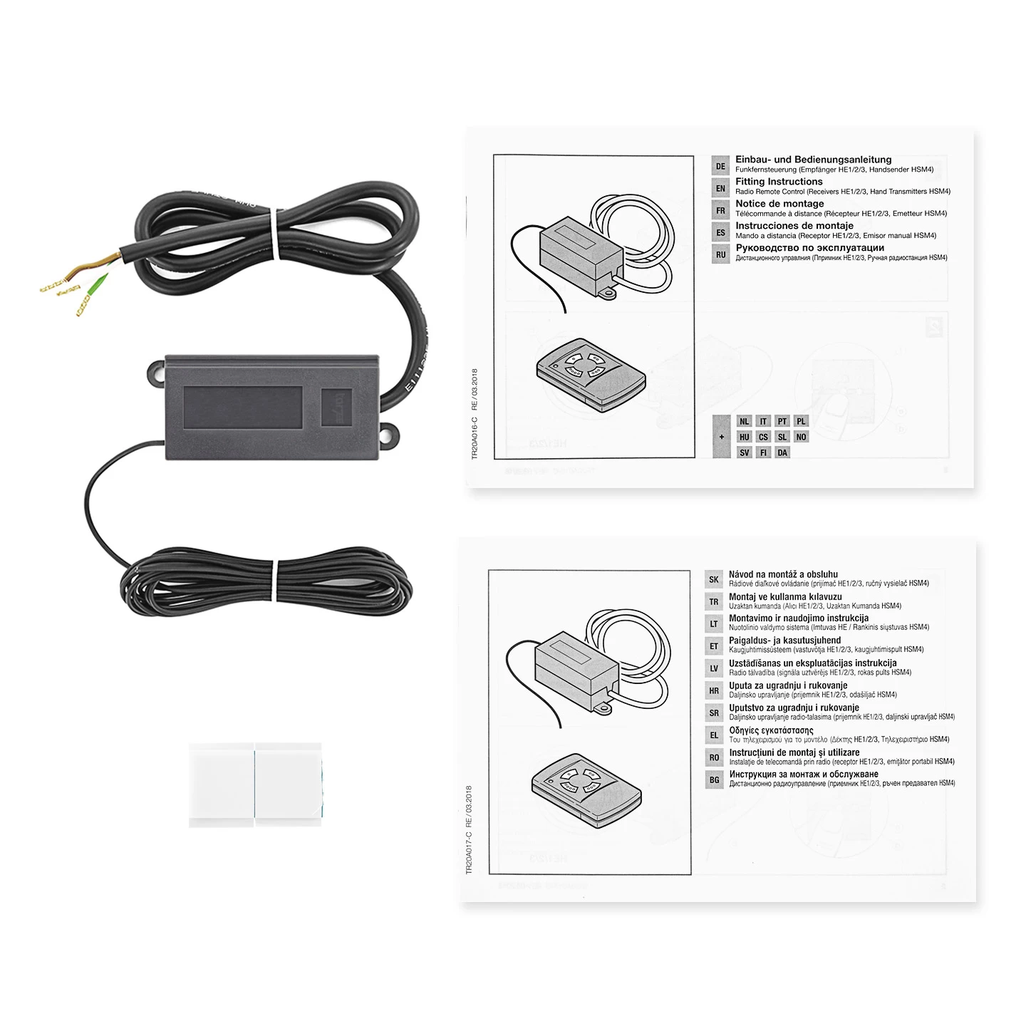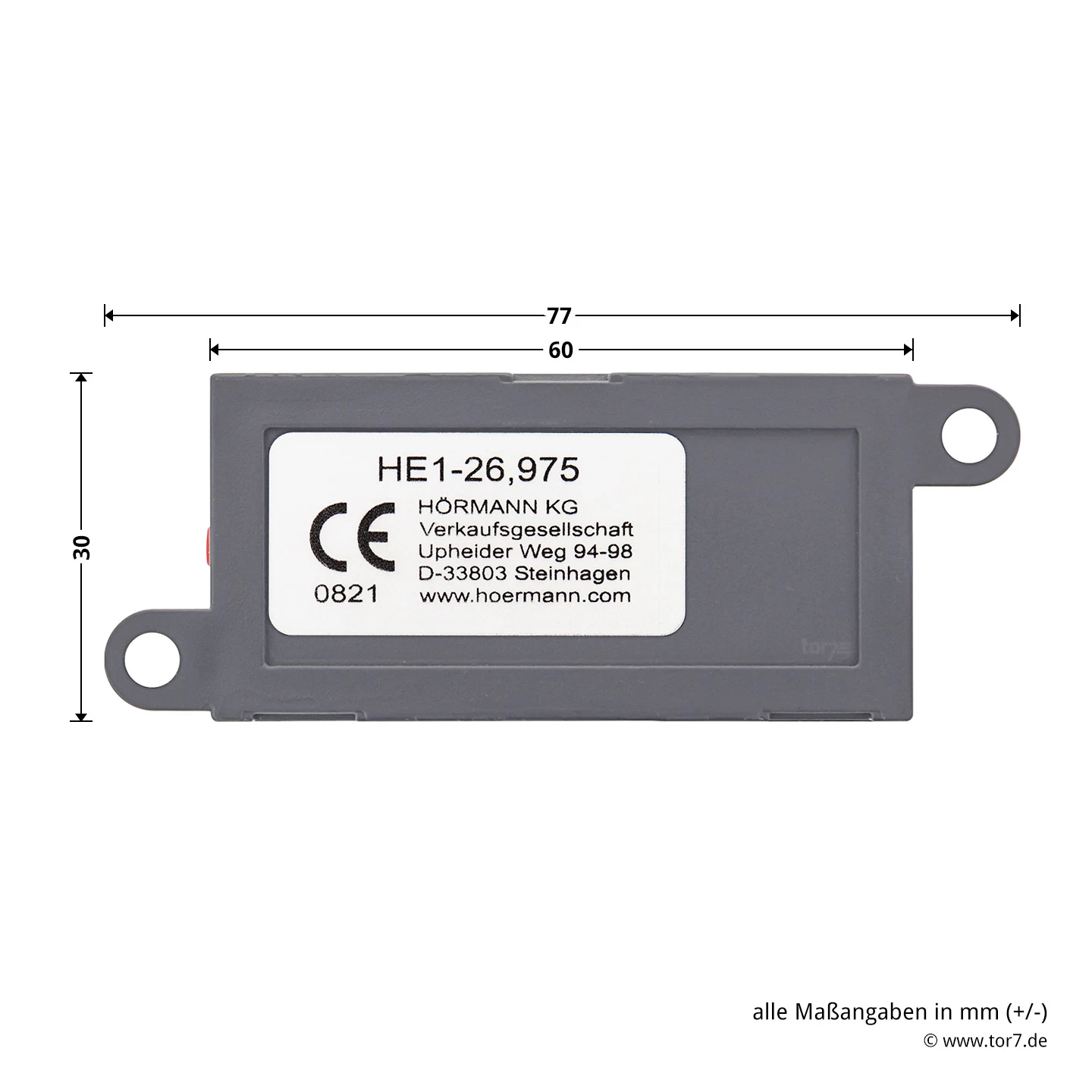 Die Verwendung ist bei allen Torantrieben nur in geschlossenen Räumen zulässig. Das separate Gehäuse aus Kunststoff dieses 1-Kanal-Empfängers HE 1 hat eine 3-adrige und steckbare Anschlussleitung von 50 Zentimeter Länge. Seine Betriebsspannung beträgt 24 Volt Gleichstrom (24 V DC) und der Funktionsimpuls 0,5 Sekunden. Der Hörmann 1-Kanal-Empfänger HE 1, 26,975 MHz, misst in Breite x Höhe x Tiefe 60 mm x 29 mm x 29 mm.