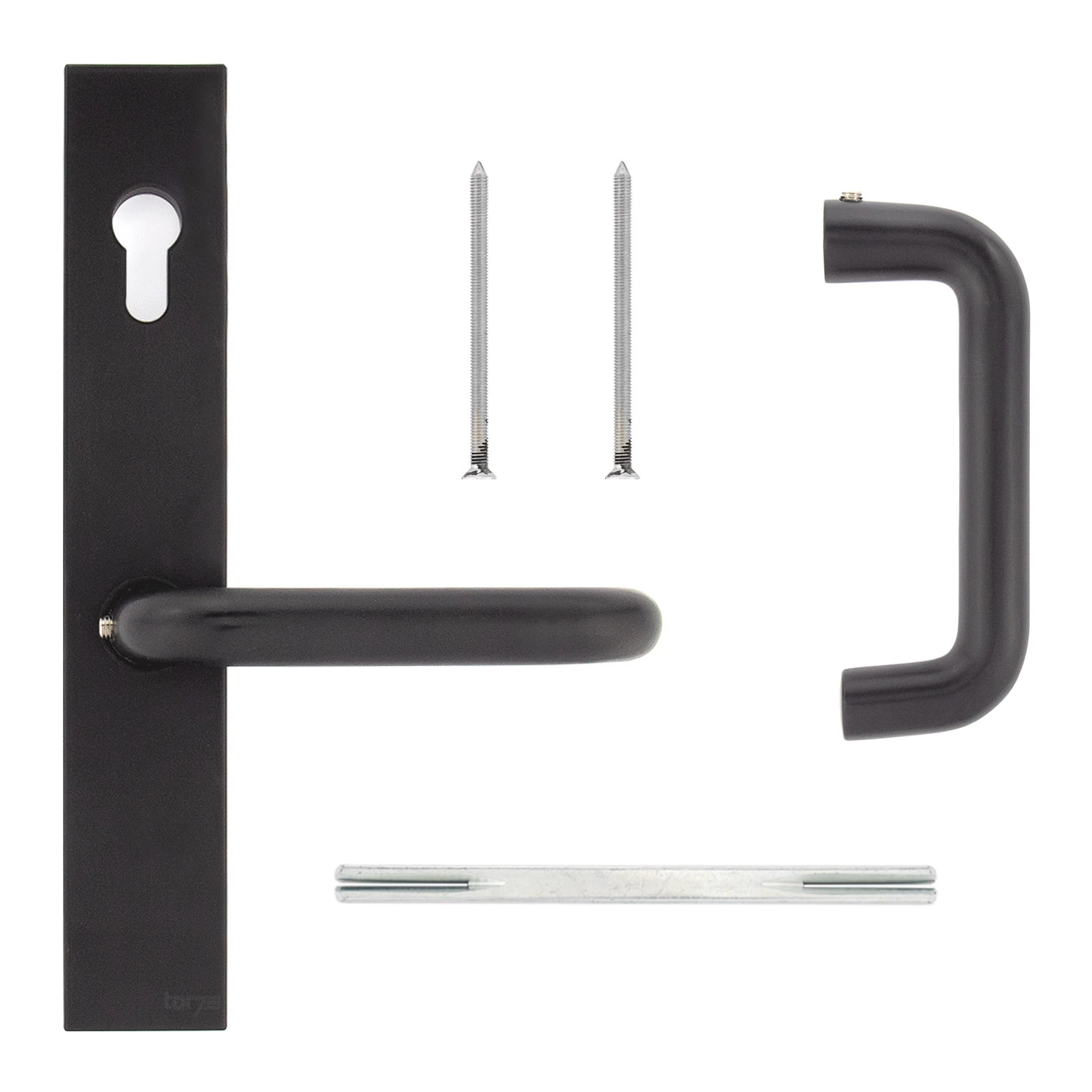 Bei der aufliegenden Drückergarnitur ist ein einzelner Torschild dabei, der auf der Außenseite über dem Schloss angebracht wird. Die Befestigung dieses Schildes erfolgt immer von der Innenseite aus, um ein unbefugtes Losschrauben zu verhindern. Alle Hauptbestandteile der Hörmann Aluminium-Drückergarnitur, Schloss aufliegend, PZ 60/60 mm, als Torschild und Griffe, bestehen aus einem beständigen schwarz lackierten Aluminium.