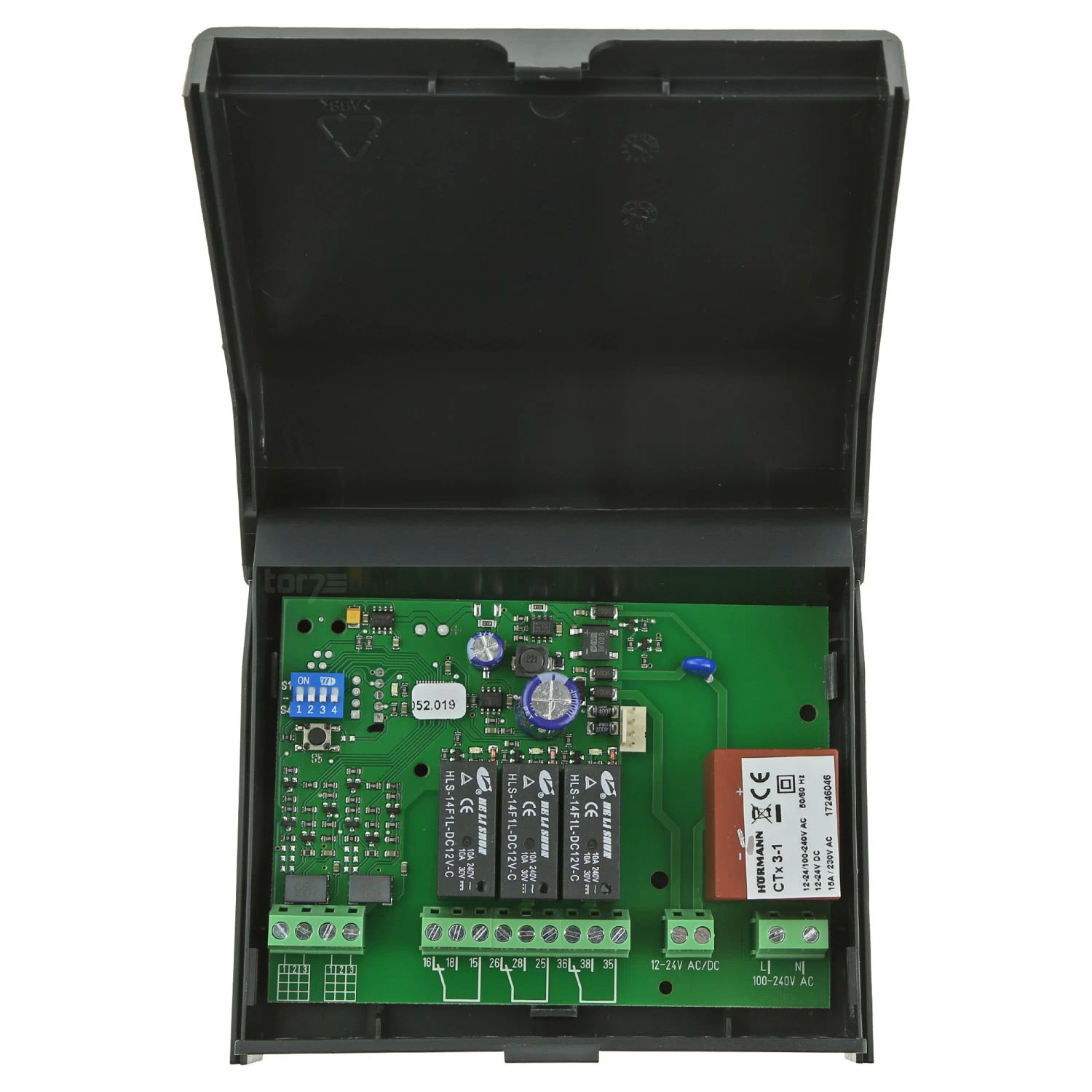 - drei separate Relaisausgänge zur Ansteuerung von zwei Antrieben, Hofbeleuchtung, zweite Öffnungshöhe