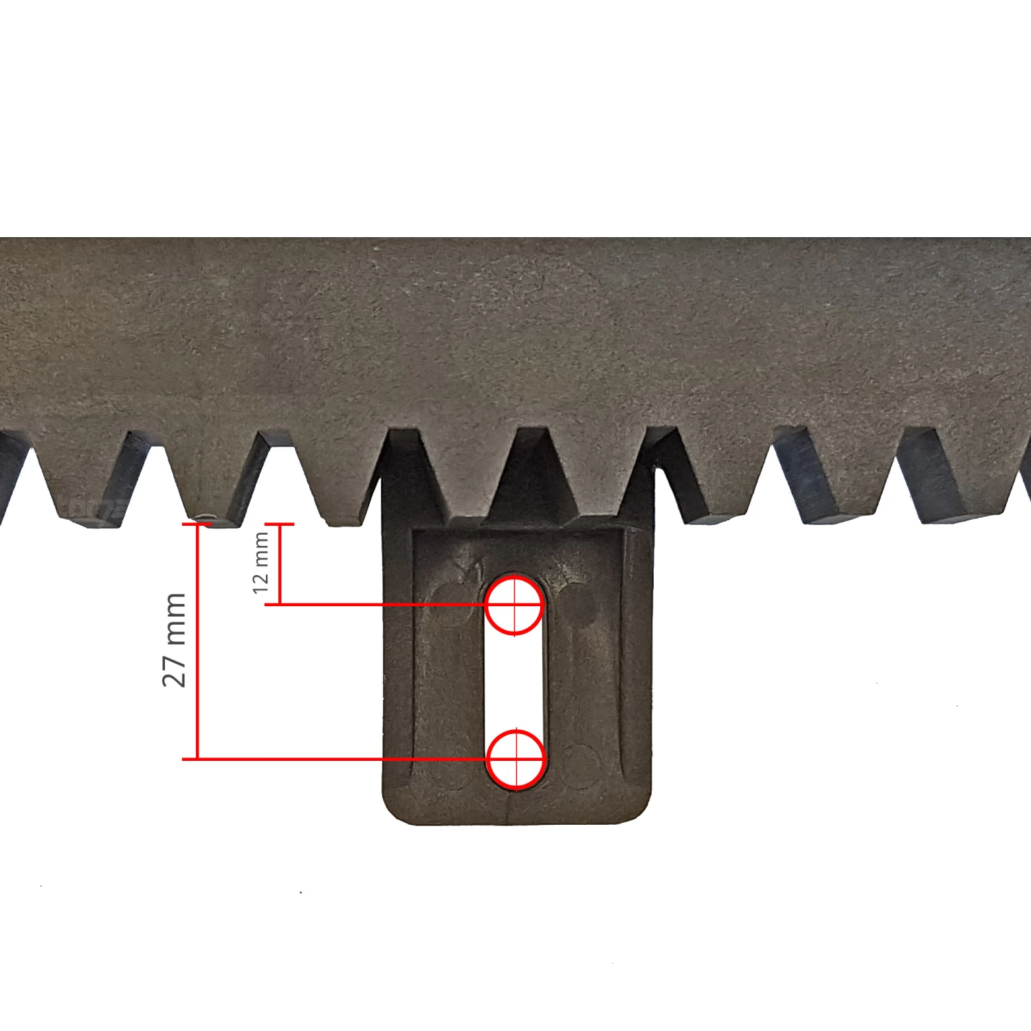Die Kunststoff-Zahnstange V6 ist ebenso wie die Hörmann Kunststoff-Zahnstange S6, Befestigung oben kompatibel mit dem Antriebsritzel Modul 4. Zum Befestigen am Torflügel verfügt die Stange über 6 Laschen, die an der unteren Seite angebracht sind. Das dazugehörige Befestigungsmaterial ist nicht im Lieferumfang inbegriffen und muss zusätzlich bestellt werden.