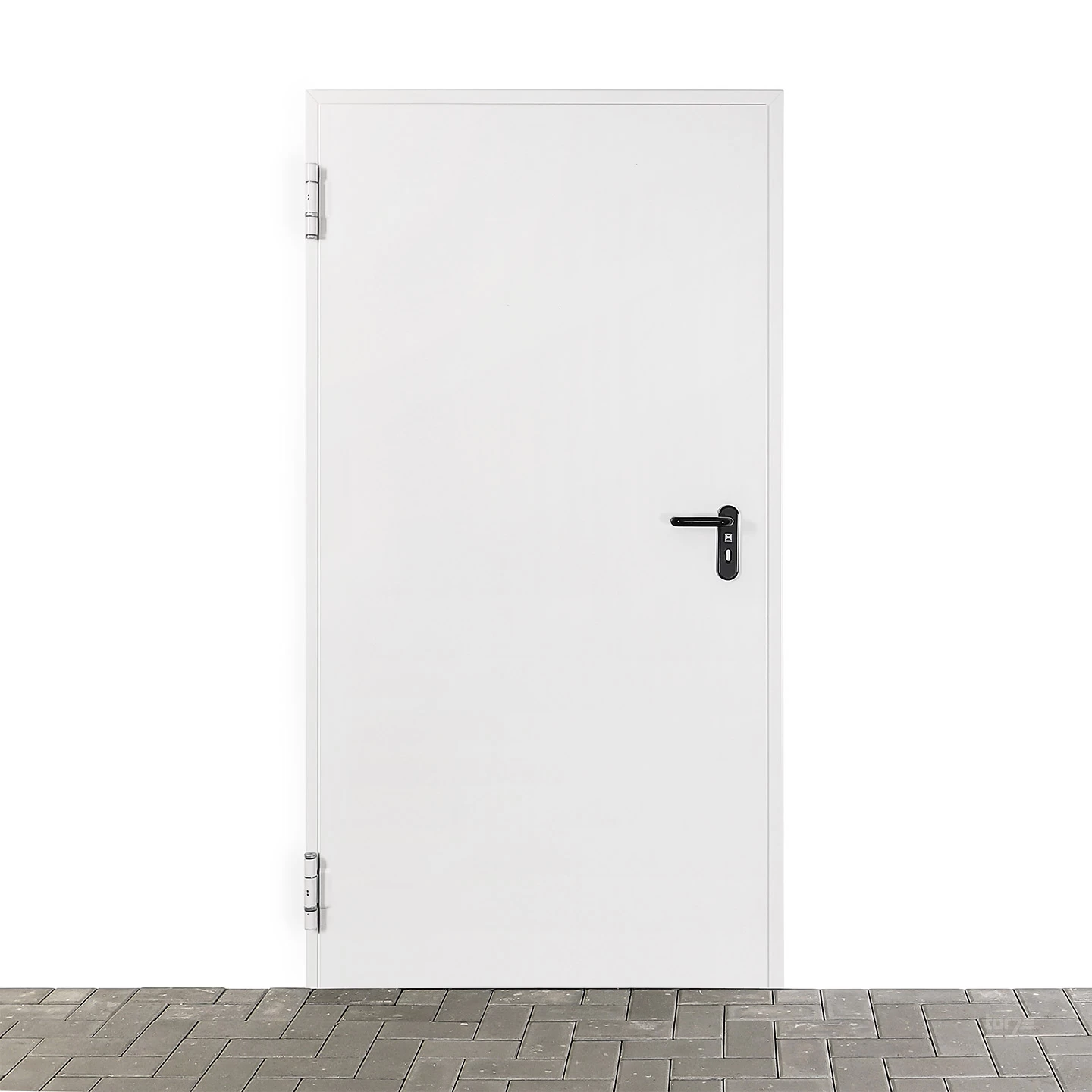 Die Hörmann Mehrzwecktür D65-1 OD ist eine hochwertige und robuste Stahltür mit einem 65 mm starken Türblatt, die im Innen- und Außenbereich in Wandaufbauten aus Mauerwerk, Beton, Porenbeton oder auch Holzständerwänden montiert werden kann. Durch die Befestigung der Universal-Eckzarge mit Diagonalbefestigung wird im Vergleich zur herkömmlichen Ankerlaschen-Befestigung ein wesentlich geringerer Montageaufwand ermöglicht. Die vollflächig verklebte Verbundkonstruktion im Türblatt und der Falz garantiert zudem eine besonders hohe Stabilität und Flügelsteifigkeit. Eine ausreichende Grundsicherheit wird durch das eingebaute PZ-gelochte Einsteckschloss, welches bauseits mit einem Profilzylinder ausgestattet werden kann, und die Stahl-Sicherungsbolzen auf der Bandseite erreicht. Neben der Hörmann Feuerschutz-Drückergarnitur, Kunststoff schwarz, U-Form, ist im Lieferumfang auch die passende Zargendichtung für OD-Stahltüren enthalten.