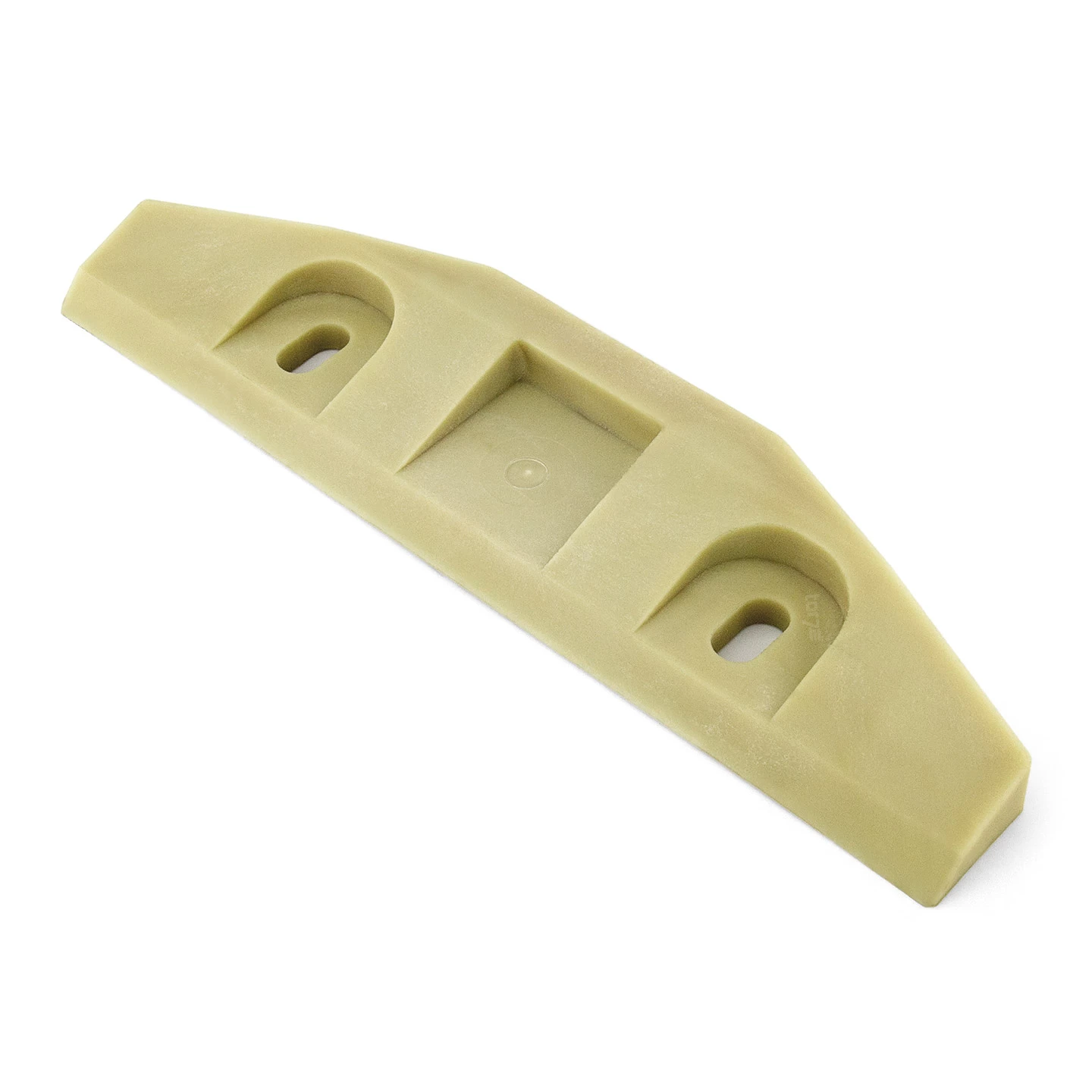 Das Führungsstück hat eine Breite von 90 mm und ist aus dem stabilen Kunststoff Polyamid gefertigt, so dass es die Belastungen durch das wiederholte Anschlagen des Torflügels aushält. Es sind zwei Befestigungspunkte mit Schraublöchern vorhanden, mit welchen das Teil am Boden befestigt werden kann. Weiterhin wird beim Hörmann mittleres Einlaufführungsstück, ohne Anschlag nicht nach der Torseite unterschieden, so dass das Teil beidseitig, also links und rechts, verwendbar ist.