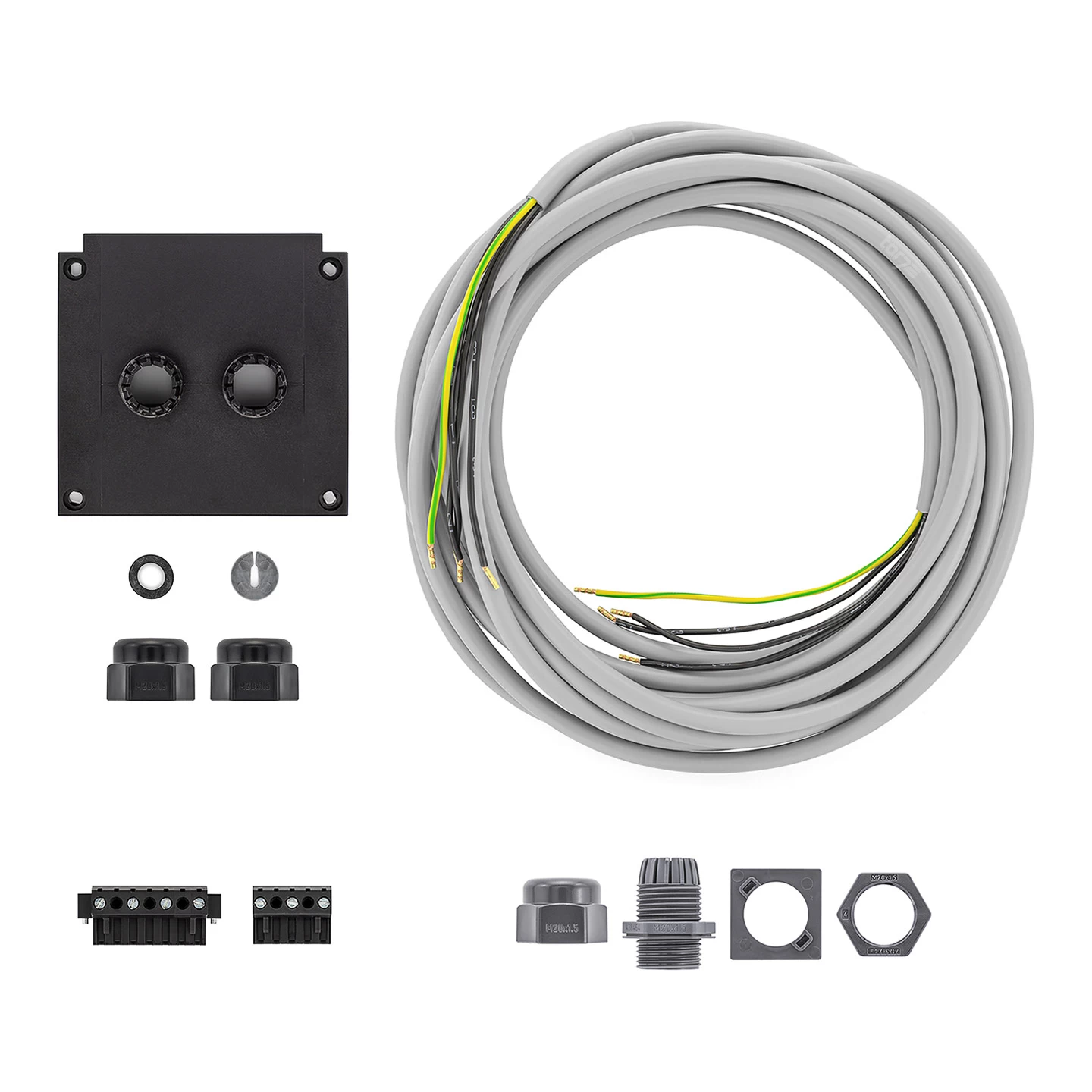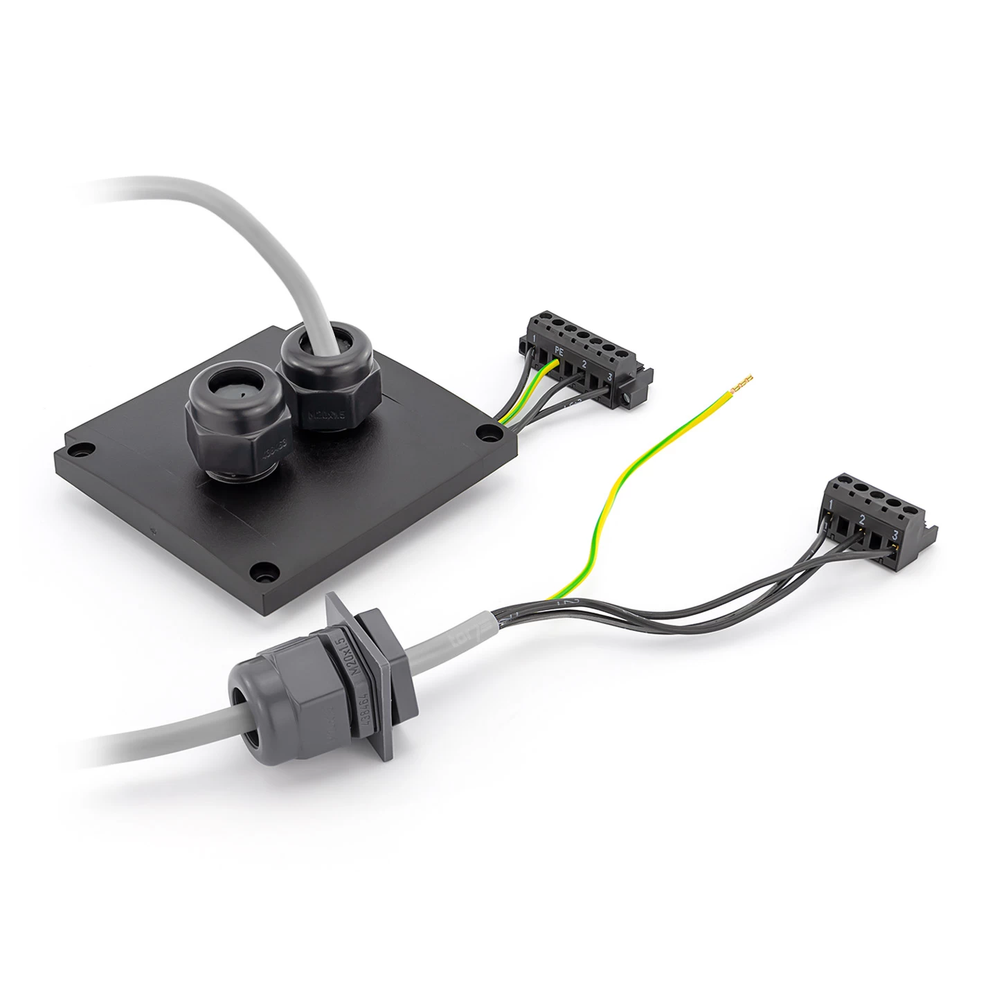 Die Motoranschlussleitungen für Hörmann Industrietorantriebe werden vormontiert mit Gehäusedeckel und zwei Schraubklemmen ausgeliefert. Hierdurch wird deren Montage erheblich vereinfacht, da die Schraubklemmen nur noch auf die dafür vorgesehenen Steckplätze am Motor und an der Steuerungseinheit aufgesteckt werden müssen.