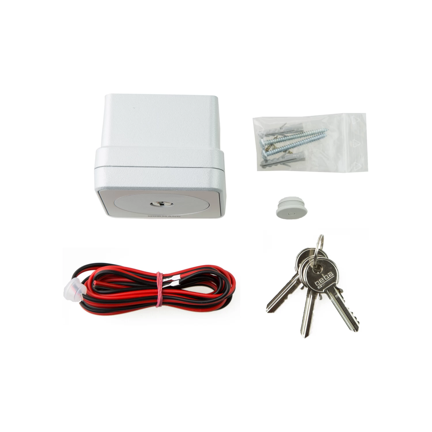 Mit Hilfe eines Schlüsseltasters können Sie Garagen öffnen oder schließen. Anders als der Hörmann Schlüsseltaster STUP 50 muss der Schlüsselschalter STAP 50 nicht in das Gemäuer eingelassen werden, sondern wird neben dem Tor montiert (Aufputz). Das zweiadrige zwei Meter lange Anschlusskabel auf der Rückseite wird mit dem Garagentor- oder Einfahrtstorantrieb verbunden.