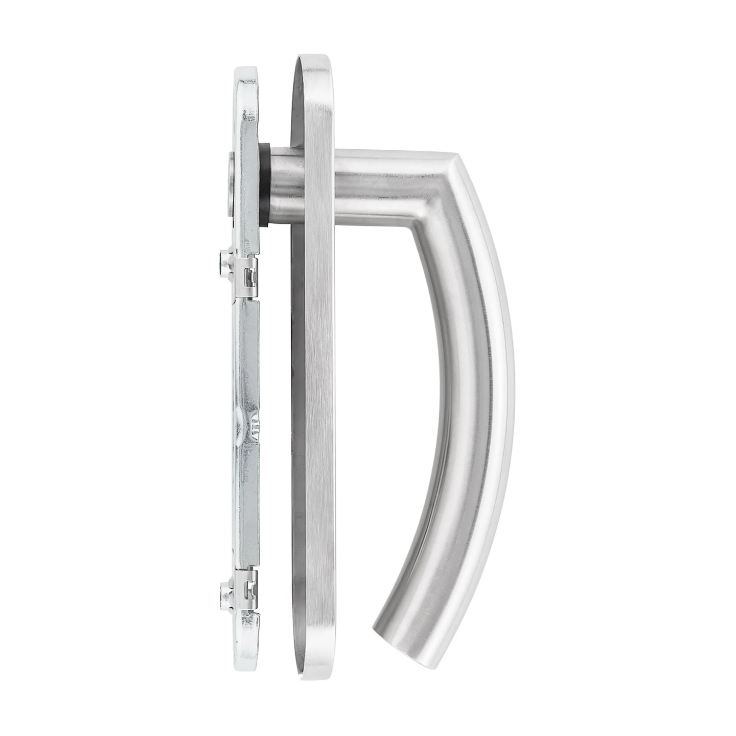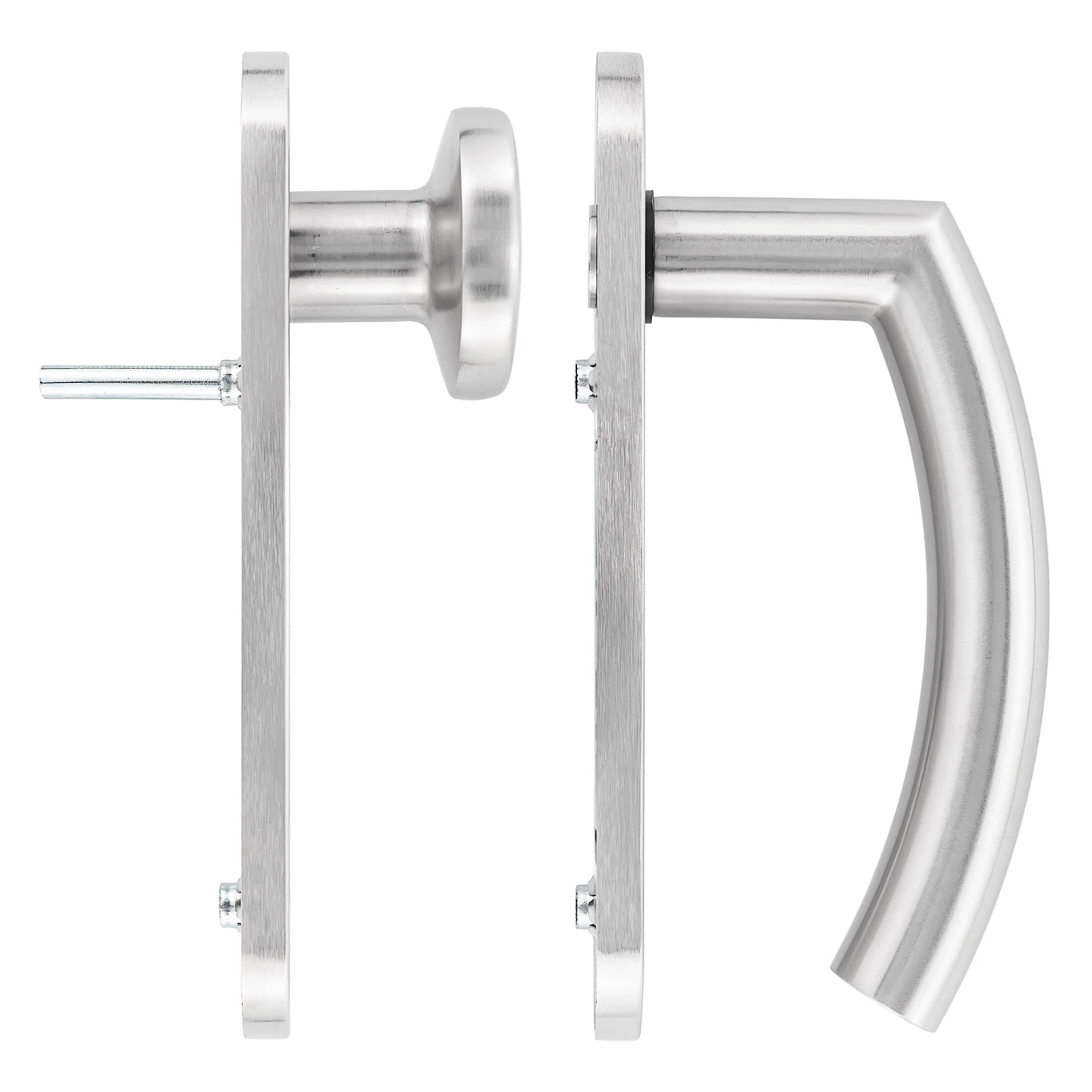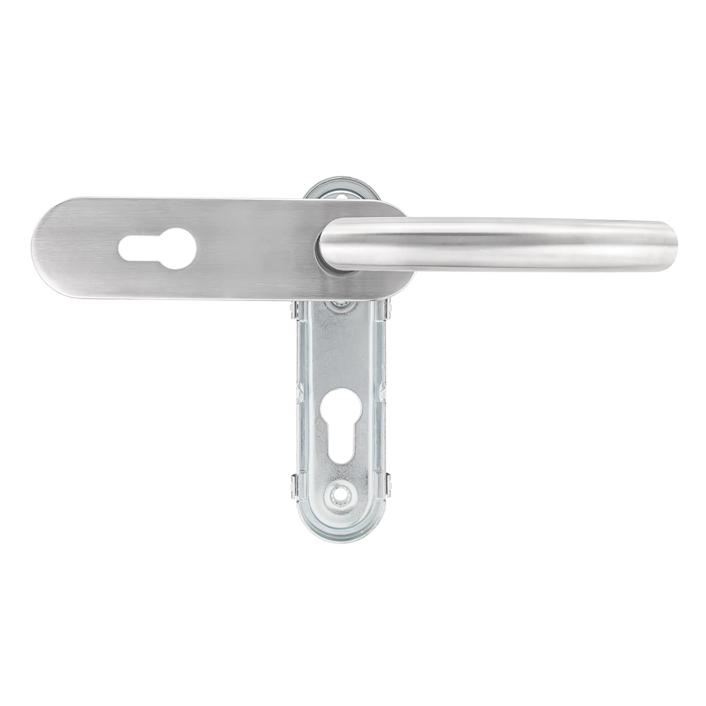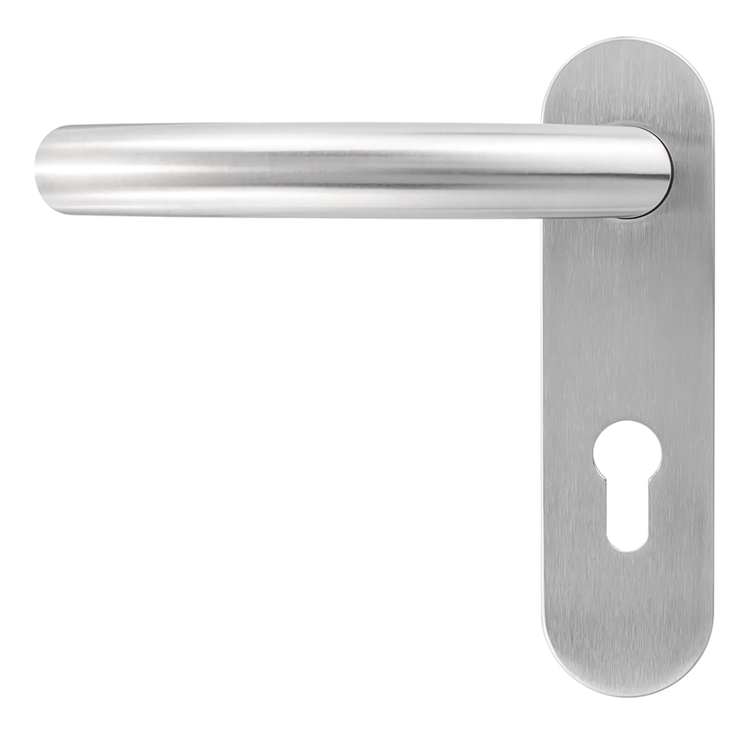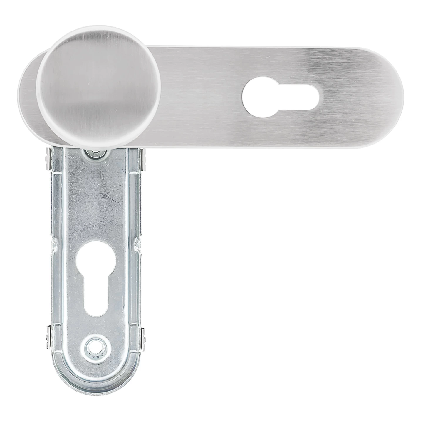 Das wartungsfreie Gleitlager aus selbstschmierenden Kunststoff ist festdrehbar gelagert und sorgt so auch bei starkem Nutzungsaufkommen für einen gleichbleibend hohen Bedienkomfort. Durch die stabile Stahlunterkonstruktion mit Stütznocken und die durchgehende Verschraubung sitzt die Garnitur dauerhaft sicher und stabil. Auch das exklusive und ansprechende Design überzeugt. Der Drücker ist im Typ 510 gefertigt und der Außendrücker als Knopf K-130. Kurzschild und Garnitur bestehen aus hochwertigem, rostfreiem Edelstahl 1.4301 und sind matt gebürstet. Die Montage ist dabei ohne großen Zeit- und Arbeitsaufwand erfolgt. Allen notwendigen Montageteile liegen der Wechselgarnitur bei.